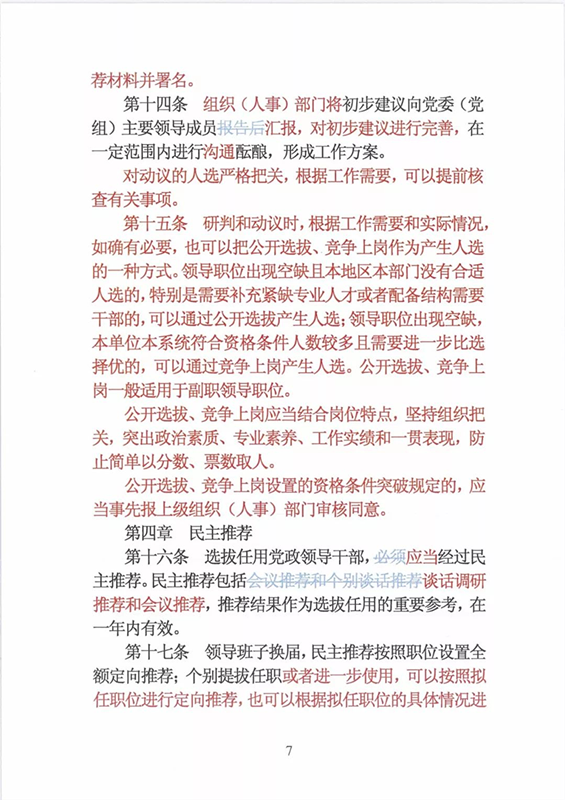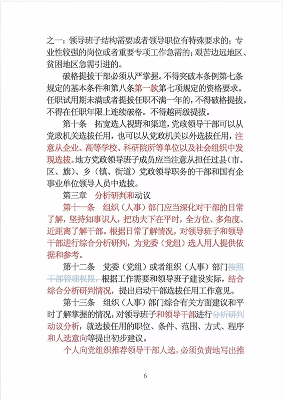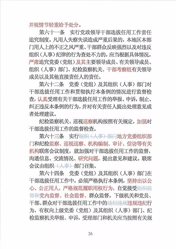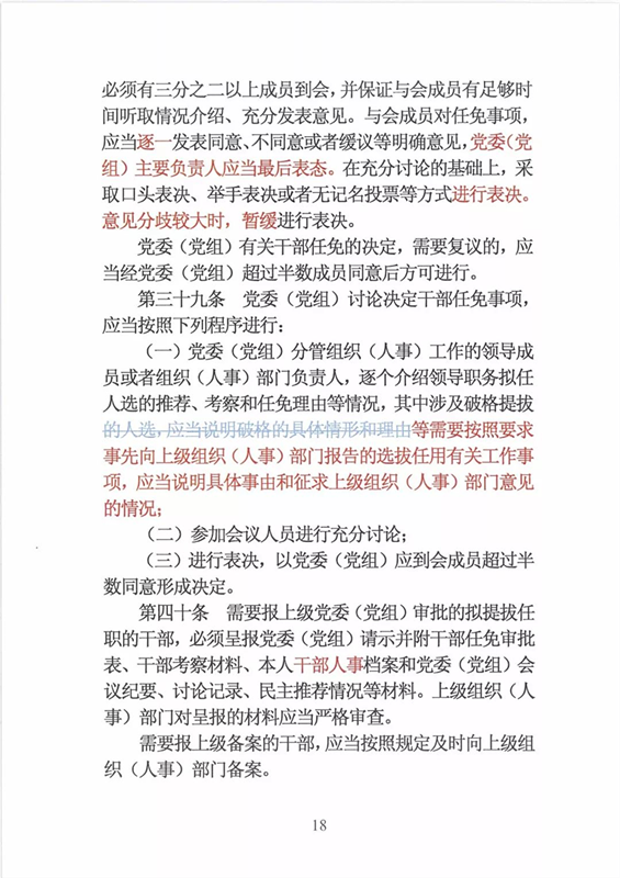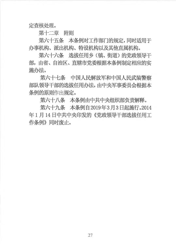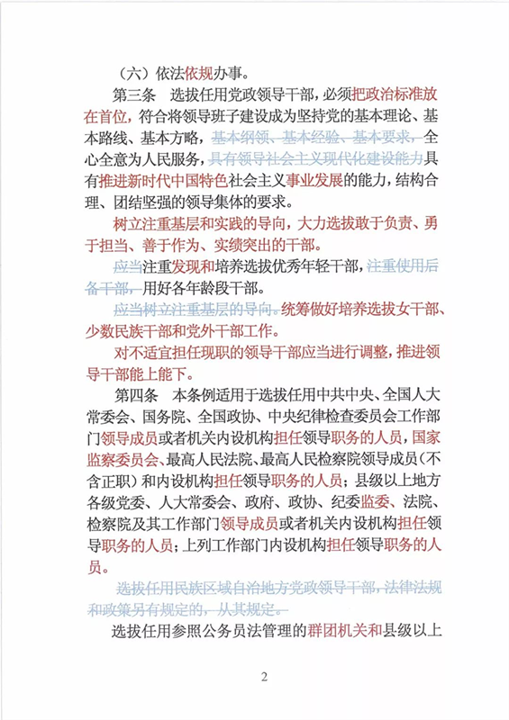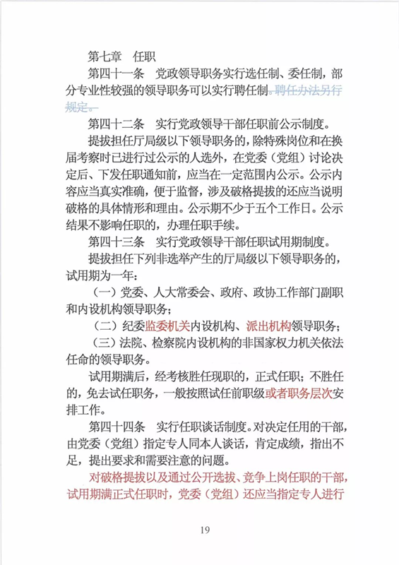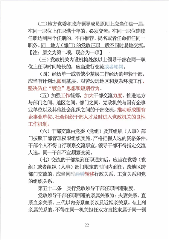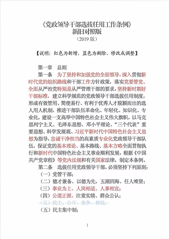 近日,中央印发了新修订的《党政领导干部选拔任用工作条例》。自1995年《党政领导干部选拔任用工作暂行条例》颁布以来,党中央先后于2002年、2014年两次作出修订,为规范干部选拔任用工作、建立健全科学的选拔任用机制、加强干部队伍建设、提高党的领导水平和执政能力发挥了十分重要的作用。同时,随着形势的发展和干部工作实际的变化,适应新时代的需要,有必要对其进行修改完善。