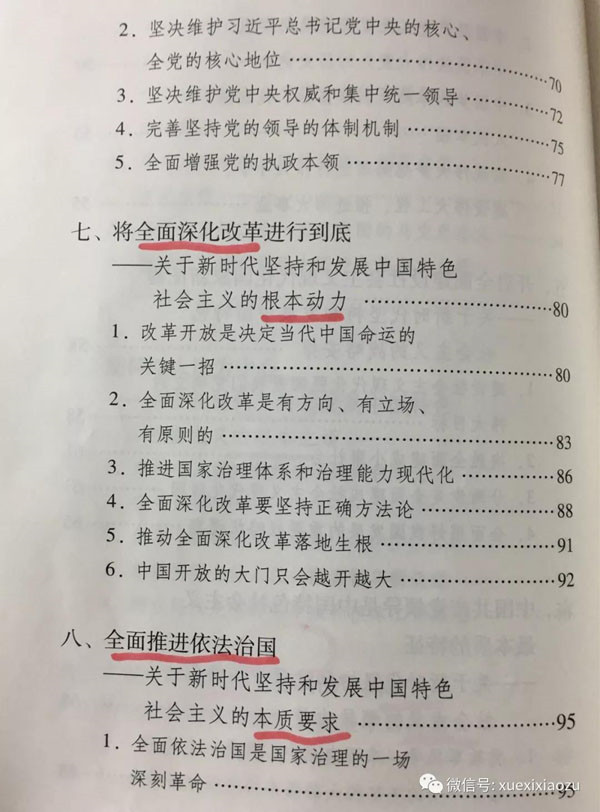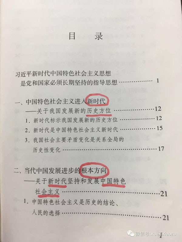 翻开《学习纲要》,共分为21章、99目、200条,近15万字,由绪论、主体部分、结语组成。我们从目录中可以看到纲要的篇章结构,《学习纲要》通篇贯穿着什么是新时代中国特色社会主义、如何坚持和发展新时代中国特色社会主义这条主线。也在目录上做了标记,可以一起先看一下。