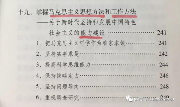 第十九章强调,掌握马克思主义思想方法和工作方法,是党员干部的看家本领,是我们的能力建设。其中,实事求是、科学思维能力、问题导向、重视调研等内容是习近平一直强调的。