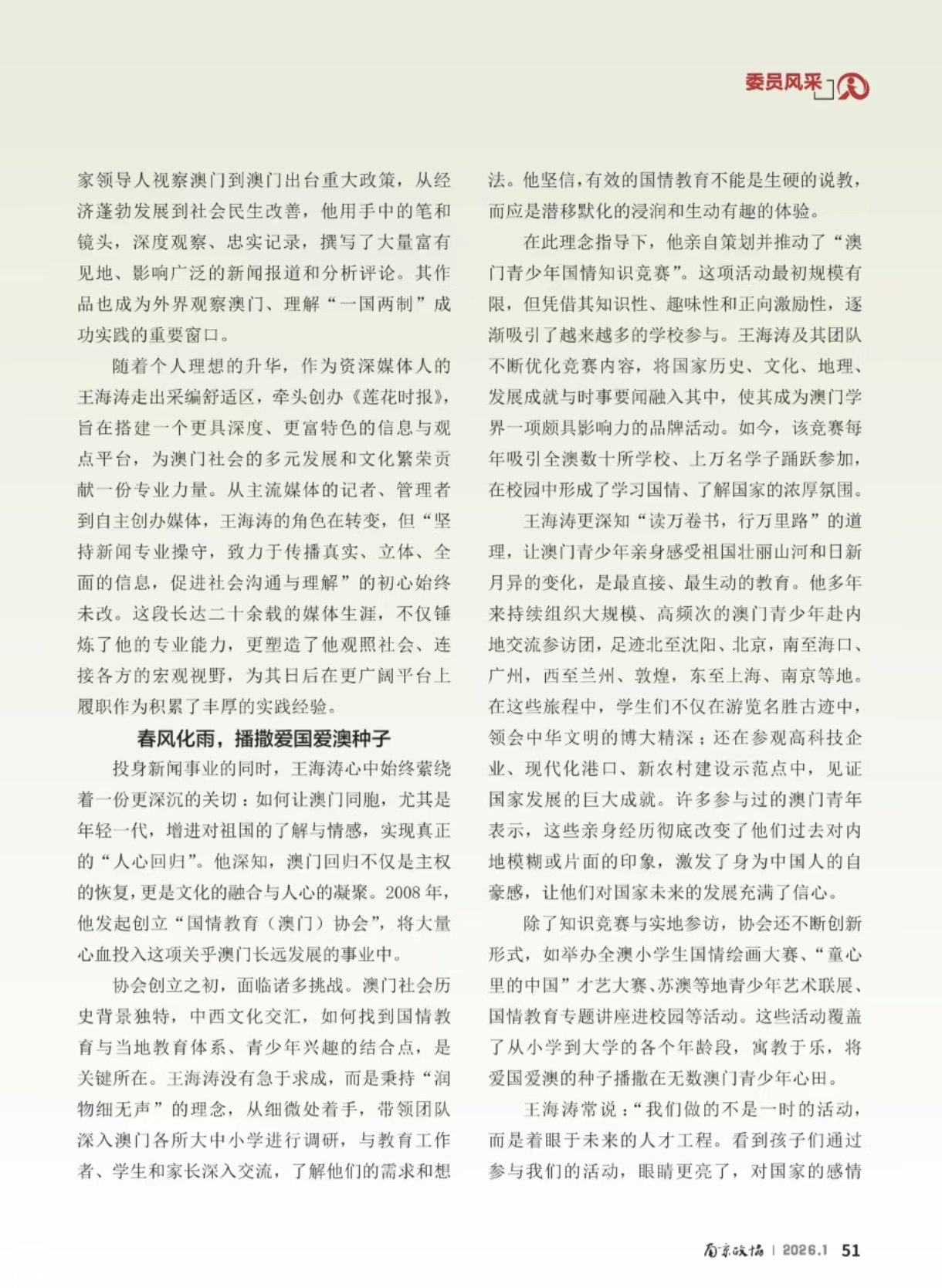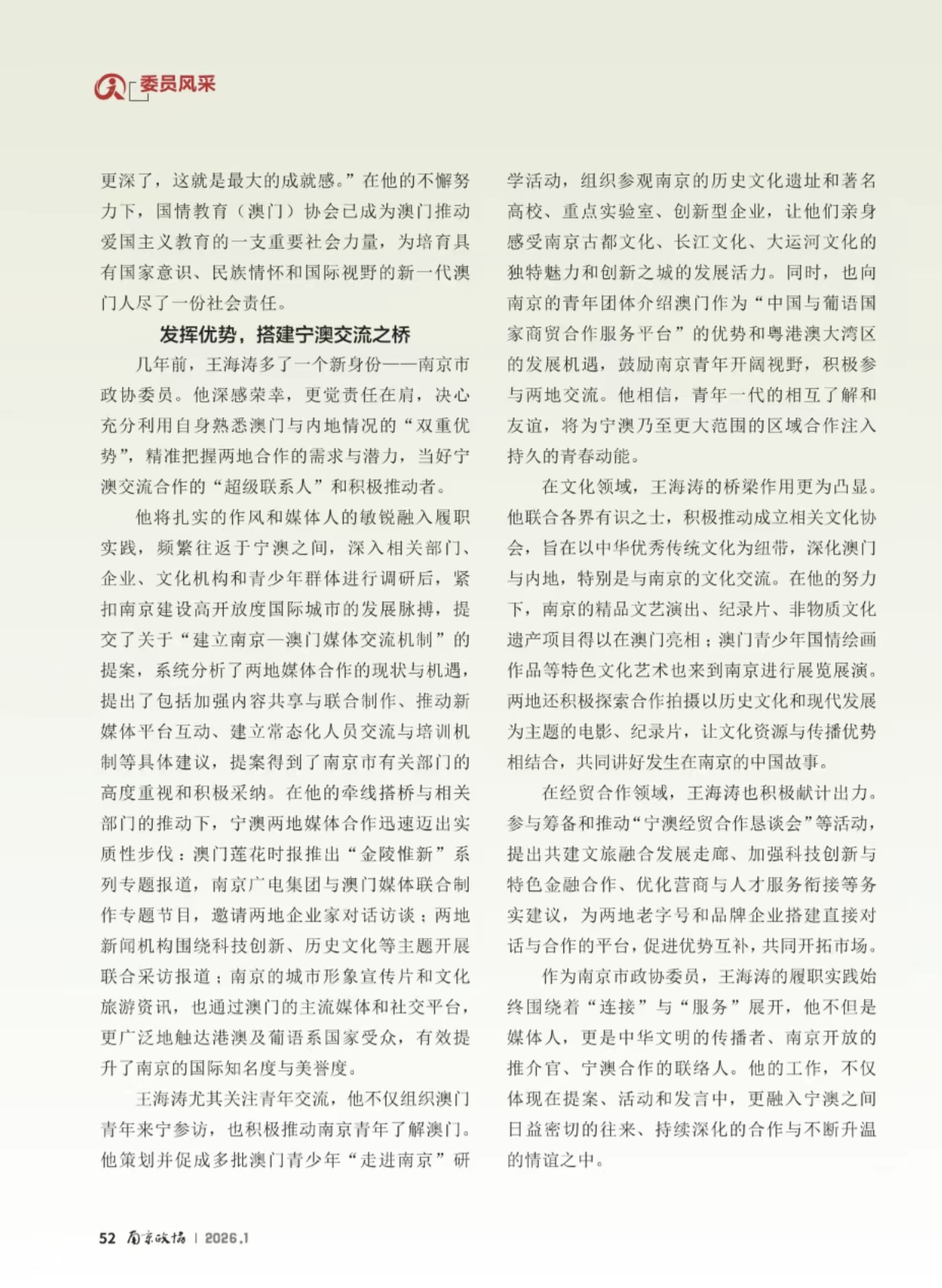 从走出故乡闯荡创业,到深耕传媒行业自主办报,再到推动宁澳交流搭建桥梁,王海涛怀揣着深厚的家国情怀,踏着新时代的鼓点笃定前行,让濠江潮涌与秦淮雅韵共情共鸣。