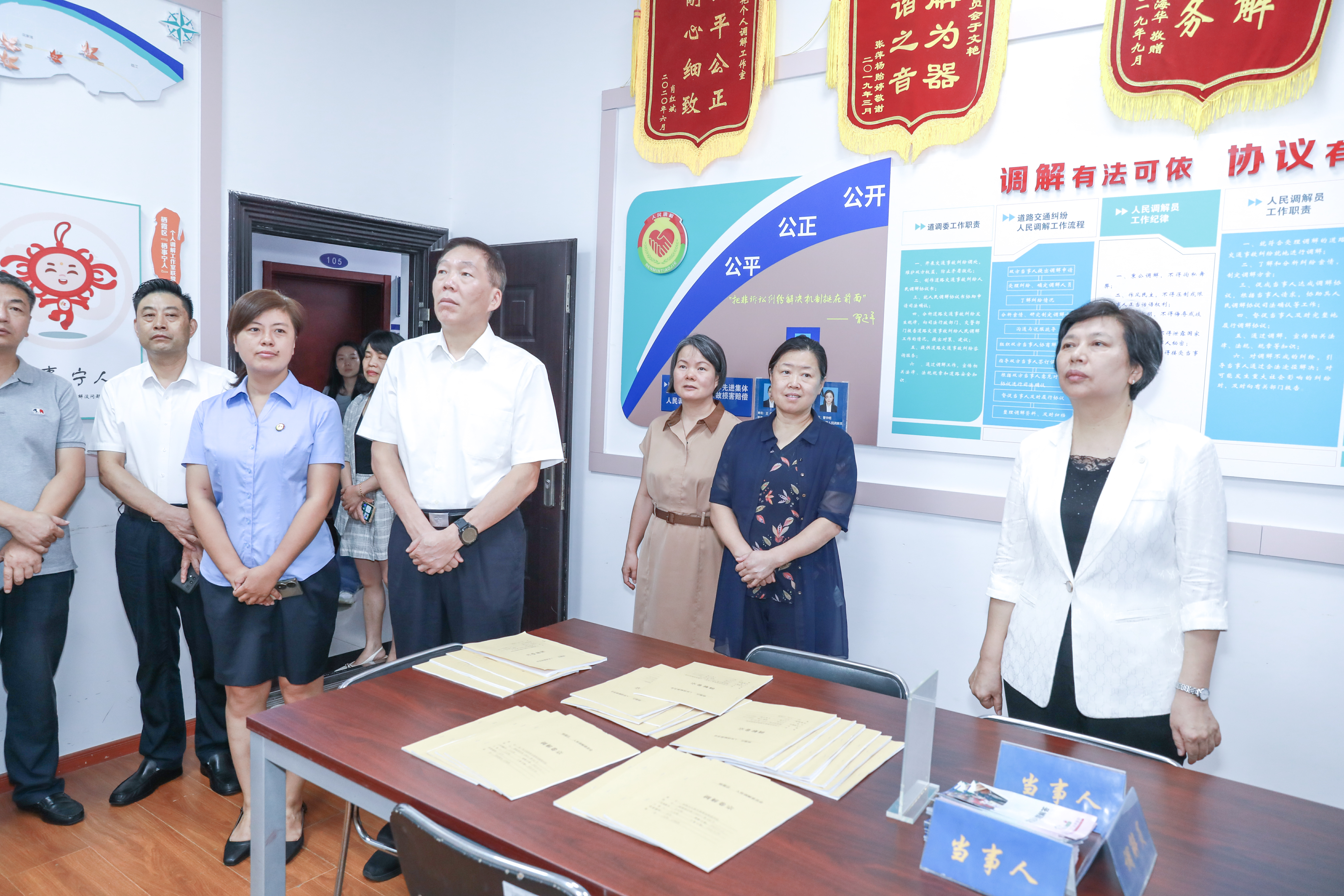 黄利民副主席一行实地察看了栖霞区道路交通事故损害赔偿调解工作室、“栖事宁人”个人调解工作室联盟建设情况,详细了解基层矛盾纠纷调解机构建设、运行机制、工作流程。