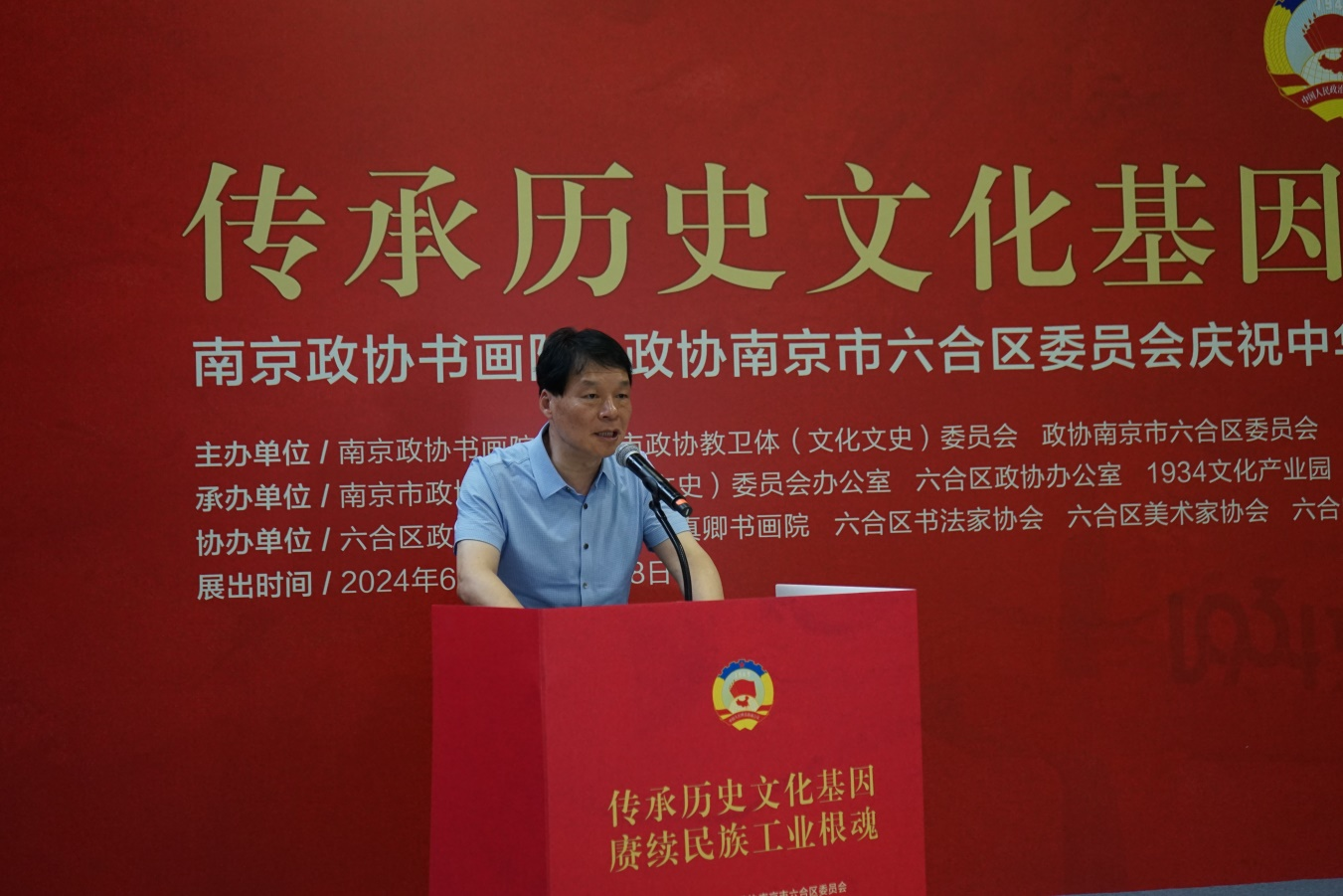 6月28日下午,由南京政协书画院、南京市政协教卫体(文化文史)委员会和六合区政协联合主办的“传承历史文化基因 赓续民族工业根魂——庆祝中华人民共和国成立暨人民政协成立75周年书画展”在1934文化产业园文化艺术空间开幕。南京市政协副主席、南京政协书画院院长李奇出席活动并宣布书画展开幕,南京市政协教卫体(文化文史)委员会副主任、一级巡视员、南京政协书画院执行院长纪增龙致辞,六合区政协主席孙宇瑾讲话。